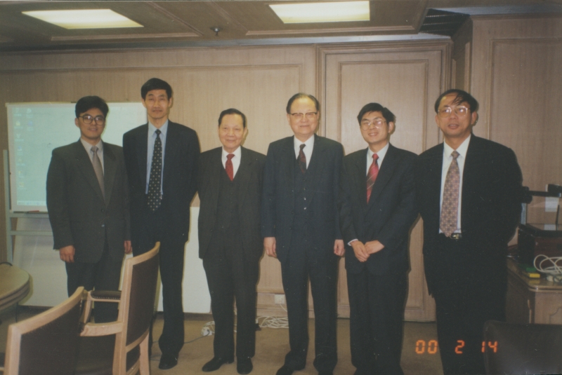 周先生和研究所骨干成员照片: 周文轩先生(南联集团董事长,左三)、周忠继先生(右三)同研究所骨干成员钱培德(左二)、朱巧明(左一)、杨季文(右二)、吕强(右一)的合影。