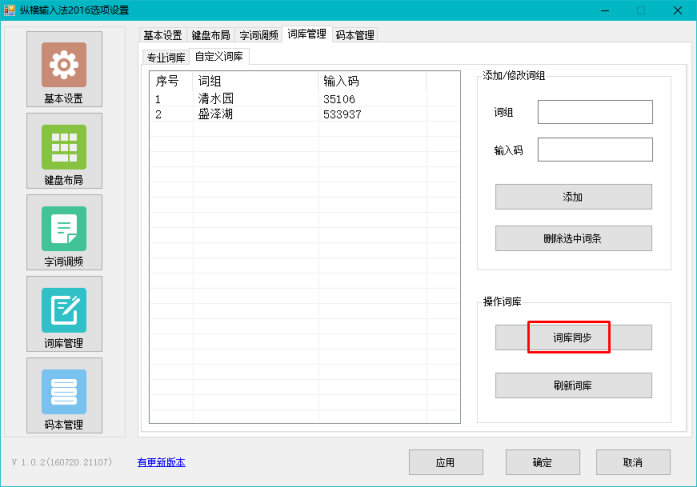 打开输入法选项设置程序后,在[词库管理]---[自定义词库]窗口,单击[词库同步],