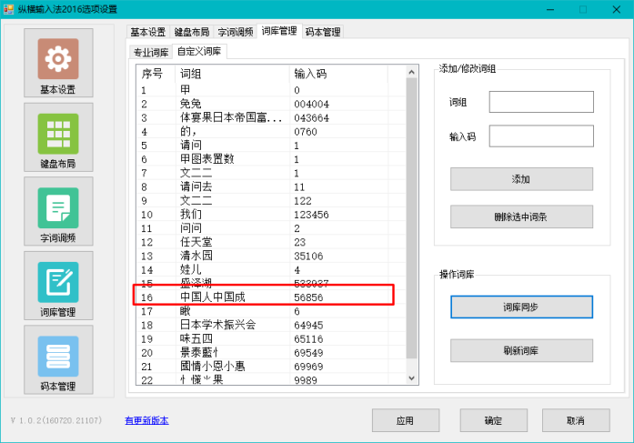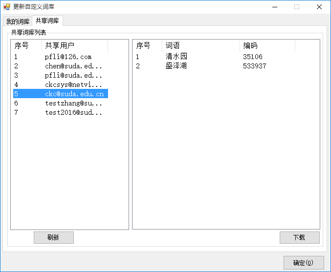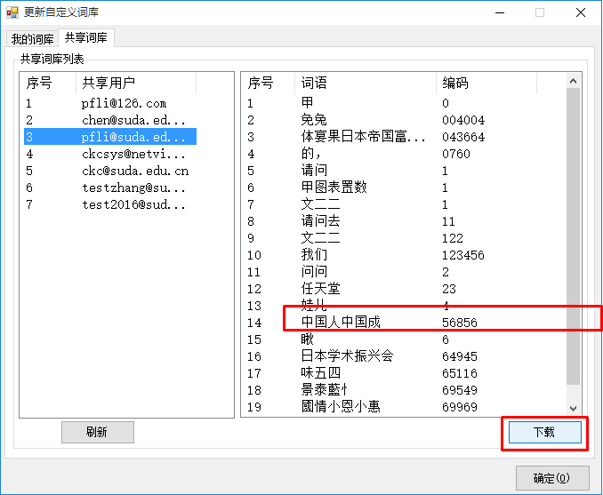 在上图窗口中选择用户,如pfli@suda.edu.cn,则出现如下图所示窗口,我们看到他的词库中有“中国人中国成”这个词;