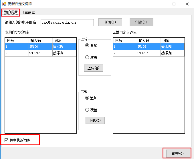 在[我的词库]标签下,确保左下角选中[共享我的词库]复选框,此时我的云端账号是ckc@suda.edu.cn;